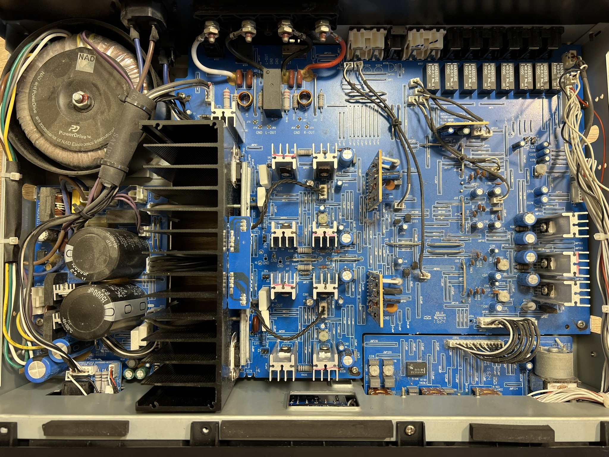 Wnętrze wzmacniacza NAD C3050. Widoczny zasilacz, preamp i selektor oraz wzmacniacz mocy.